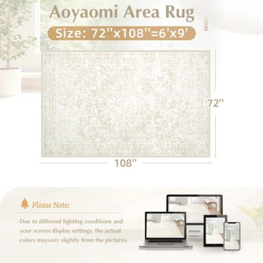 • Vintage Living Room Area Rug - 6x9 Large Machine Washable Boho Area Rug Distressed Floral Rugs for Bedroom, Soft Non-Slip Indoor Floor Accent Rugs for Office Dining Room (Cream Beige, 6'x9')